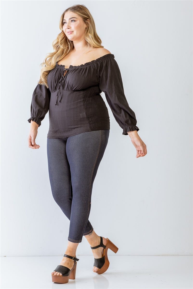 Plus Cotton Embroidery Off-the-shoulder Smocked Back Top